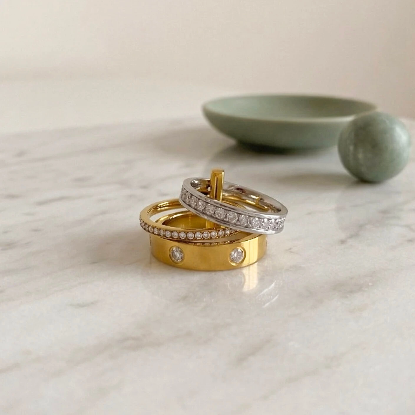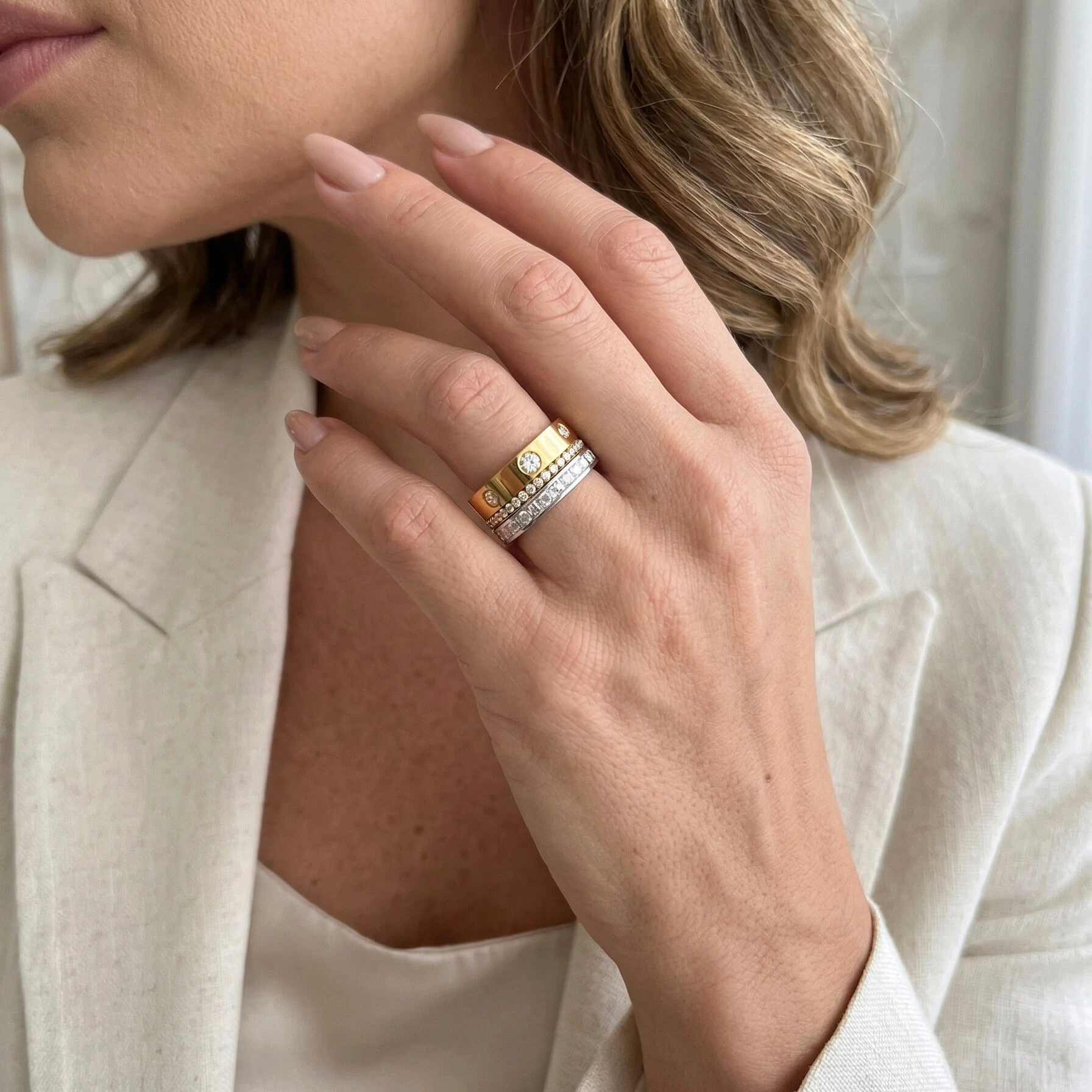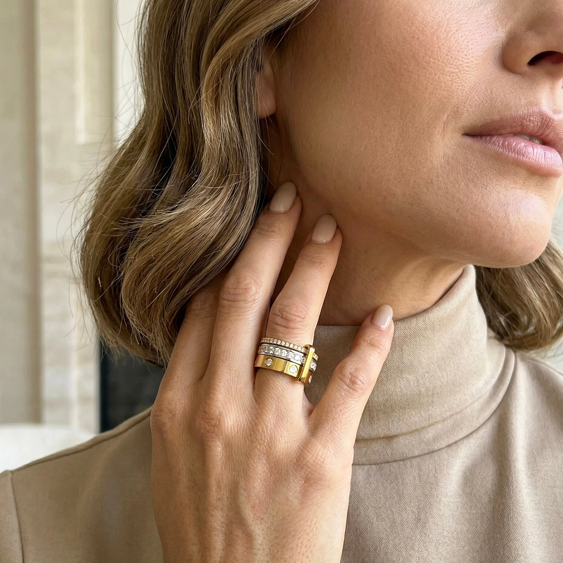 em uma composição marcante e equilibrada. O dourado e o ródio se unem em um desenho contínuo,