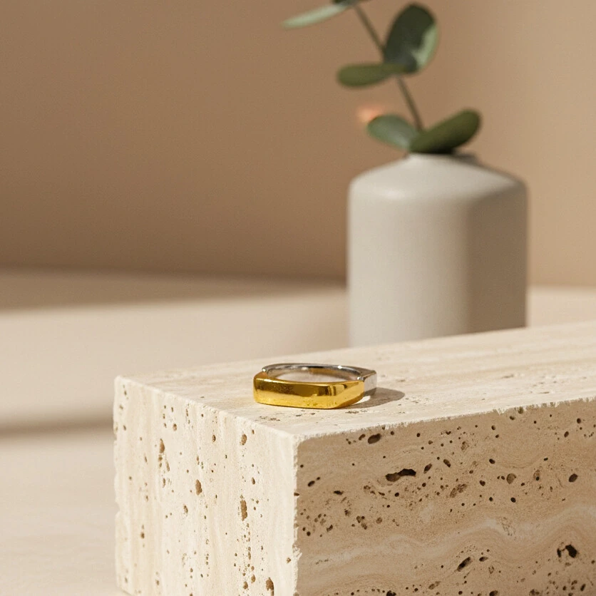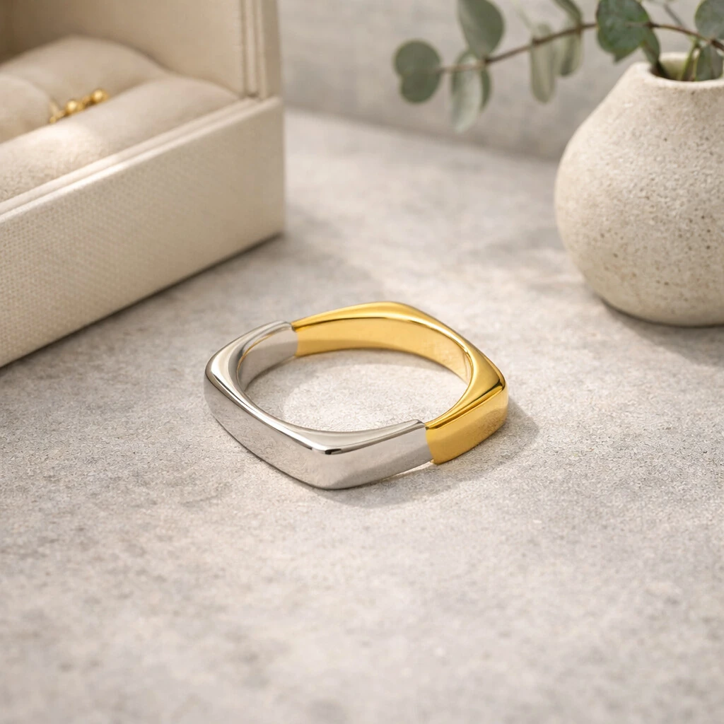 O Anel Aria traduz a harmonia perfeita entre modernidade e sofisticação. Com design escultural e composição em mix de banhos — dourado e prateado — é uma peça que celebra o contraste com elegância. Banho de Ouro 18k e Ródio Branco, totalmente livre de níquel e antialérgico, oferecendo brilho intenso e alta durabilidade. Essencial para produções que pedem impacto sutil e atemporal.