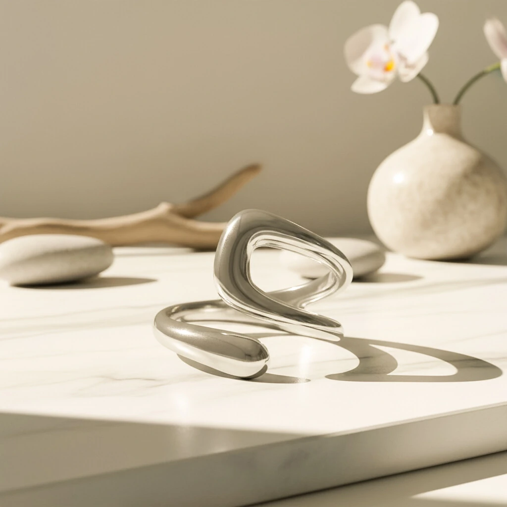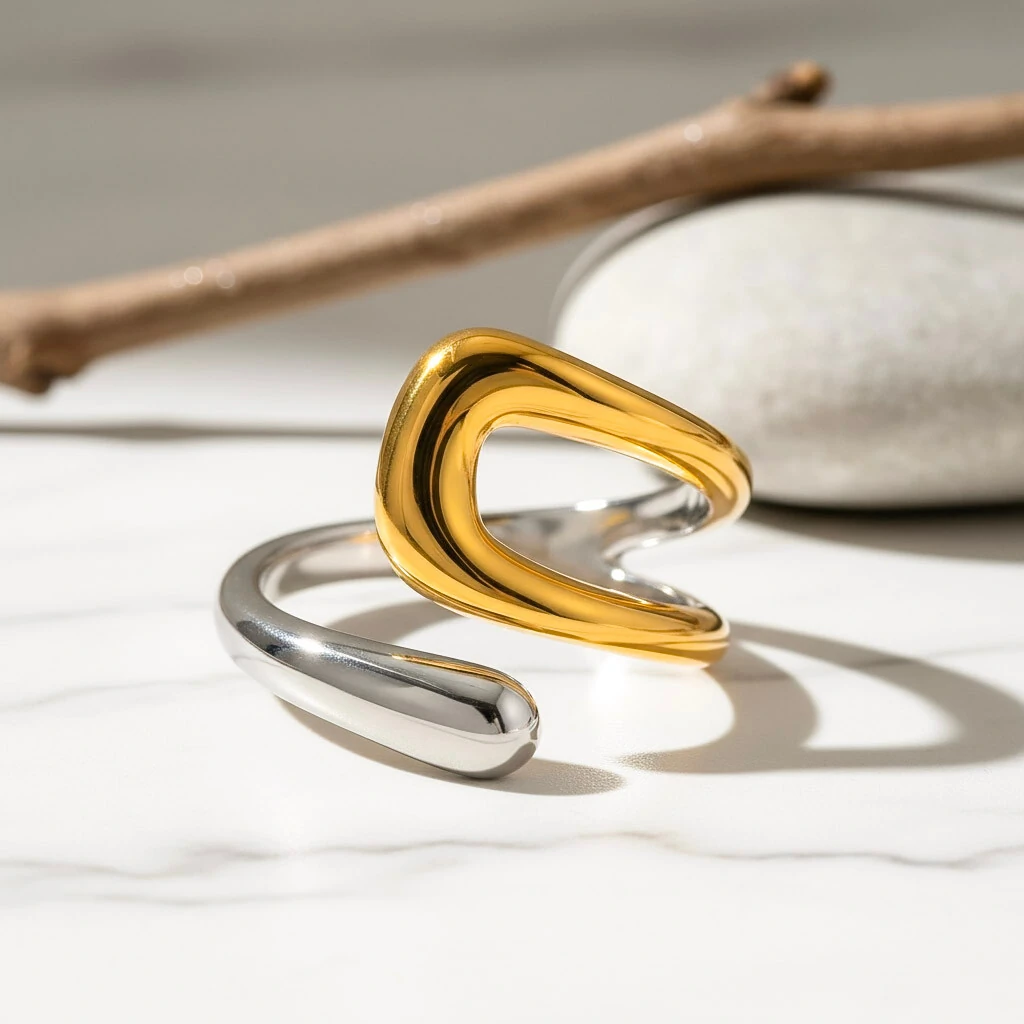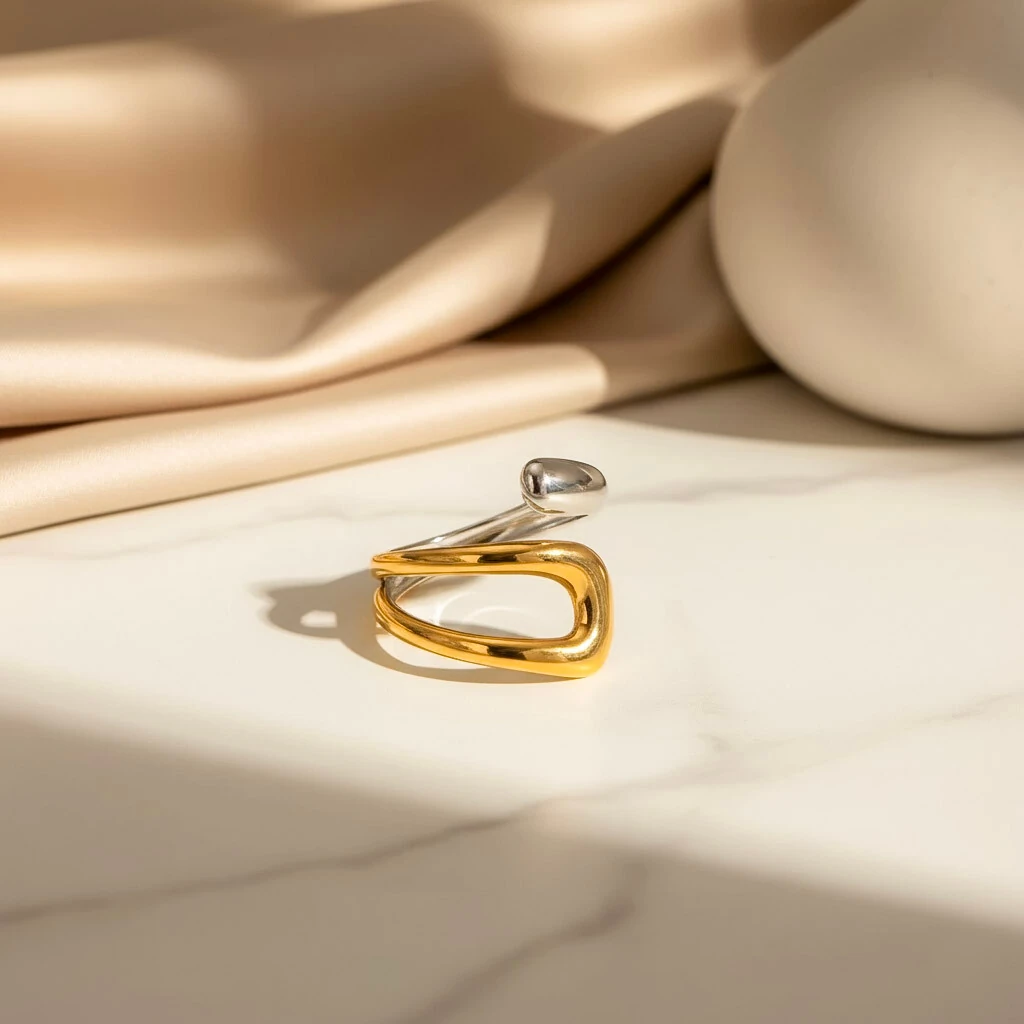 Escultural e contemporâneo, o Anel Ava traduz o luxo do essencial com seu design assimétrica e acabamento espelhado em prata e dourado. Um design que brinca com o vazio e o volume, refletindo força, leveza e personalidade em cada curva. Minimalismo com presença.
