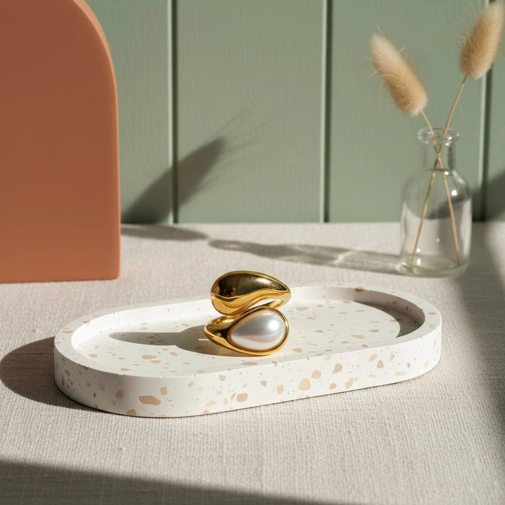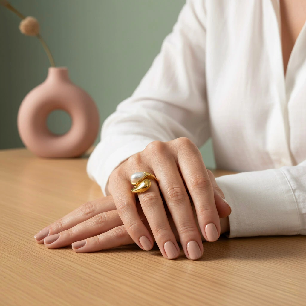 O Anel Celine é a tradução perfeita entre arte e elegância. Com curvas orgânicas e uma pérola central que flutua sob estrutura dourada, essa semijoia une força e delicadeza em um só gesto. Um toque escultural que transforma qualquer composição com sofisticação silenciosa.