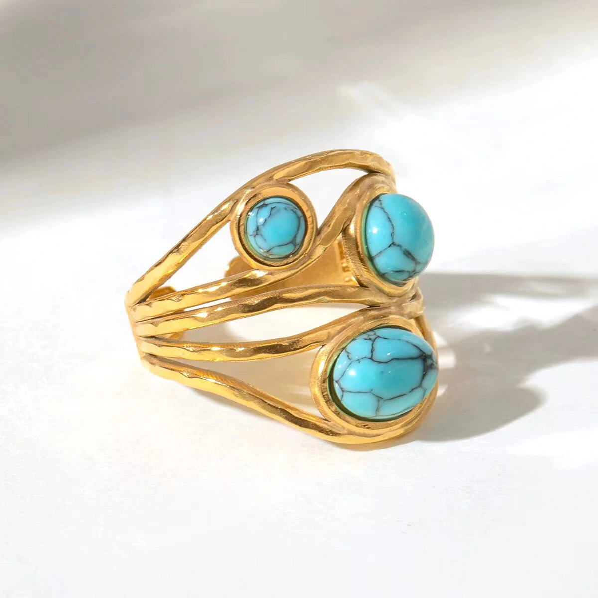 Ele segue a tendência BOLD (robusta), com um design escultural e orgânico que abraça elegantemente as três pedras Turquesas,