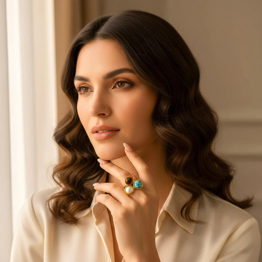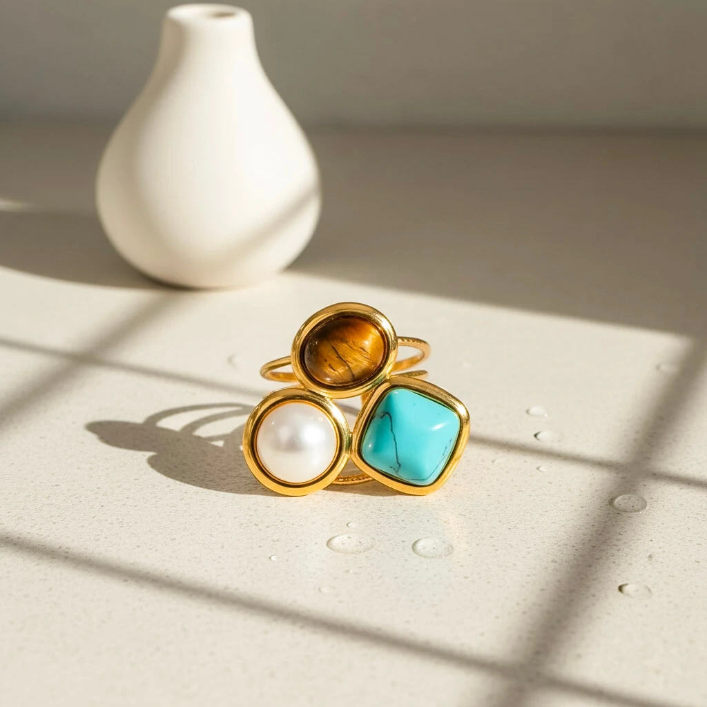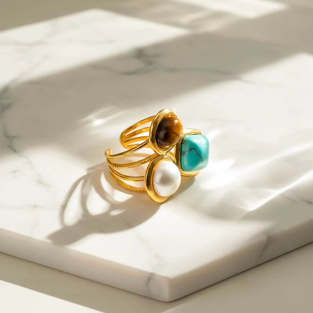 O Anel Bold com Pedras Naturais e Pérola Shell é uma verdadeira obra de arte da curadoria refinada.