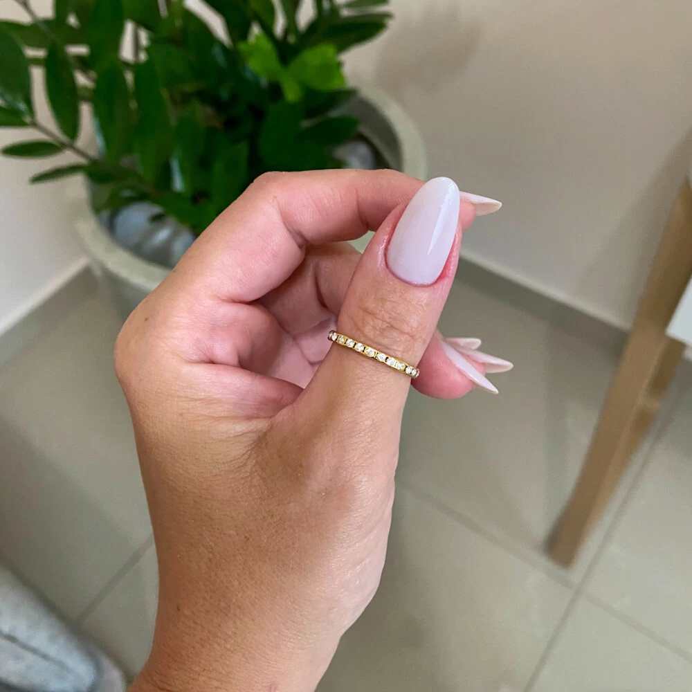 O Anel Serena é a definição de elegância atemporal. Com aro fino cravejado de zircônias, ele combina delicadeza e sofisticação em uma peça versátil e luminosa. Perfeito para compor camadas ou brilhar sozinho com discrição. Um clássico reinterpretado com leveza e design limpo.