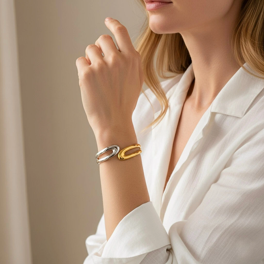 Minimalismo com expressão. O Bracelete Arta traduz leveza e presença, com linhas fluidas e vazadas que acompanham o movimento do corpo, perfeito para composições modernas e sofisticadas.