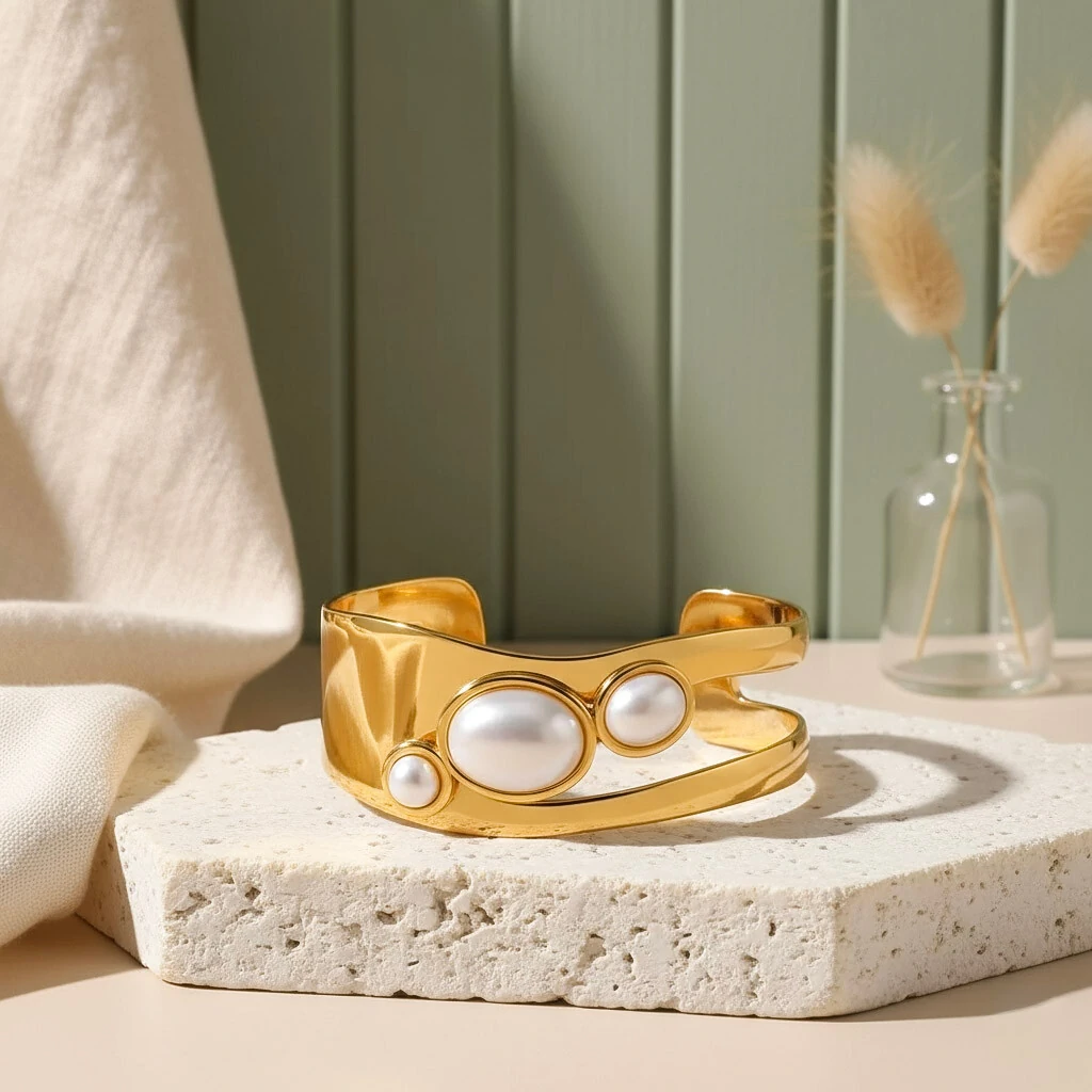O Bracelete Celine é um clássico contemporâneo que combina o brilho intenso do dourado com a sofisticação eterna das pérolas. Seu design aberto e estruturado abraça o pulso com elegância, enquanto as três pérolas naturais, dispostas em harmonia, criam um ponto focal refinado. Uma peça que transita entre o moderno e o atemporal, perfeita para transformar qualquer produção com um toque de luxo discreto.