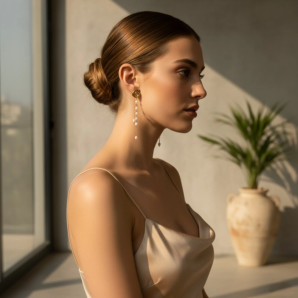 O design alongado do Brinco Cascata pede composições que valorizem o colo e os ombros,