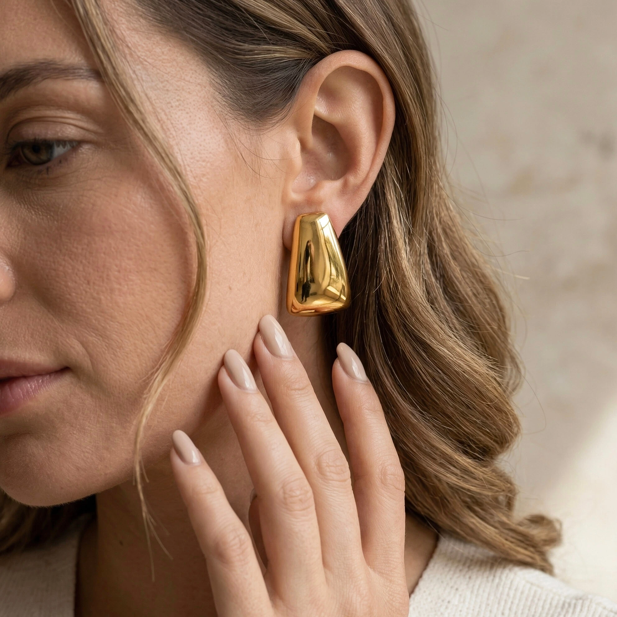 O Brinco Prisma traz volume e presença em um desenho limpo, onde o brilho do dourado valoriza cada ângulo da peça. Um modelo que se destaca pela forma contemporâneo e seguro.