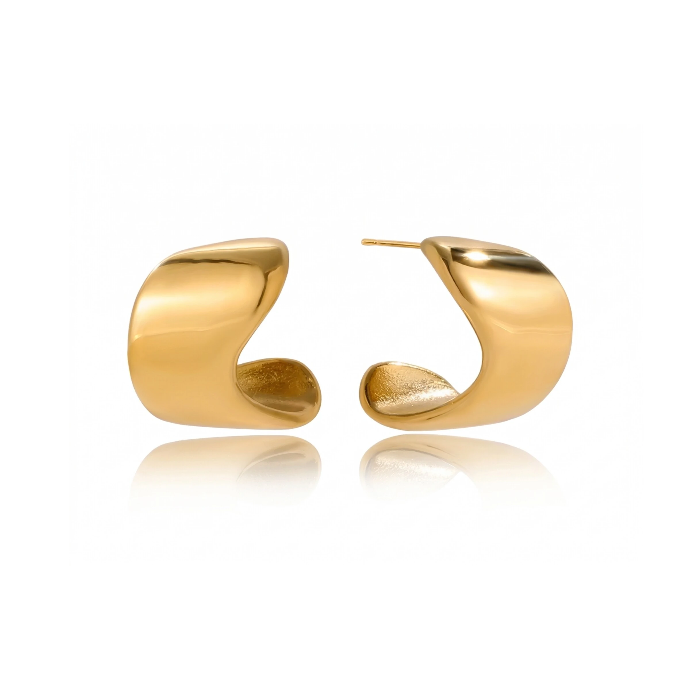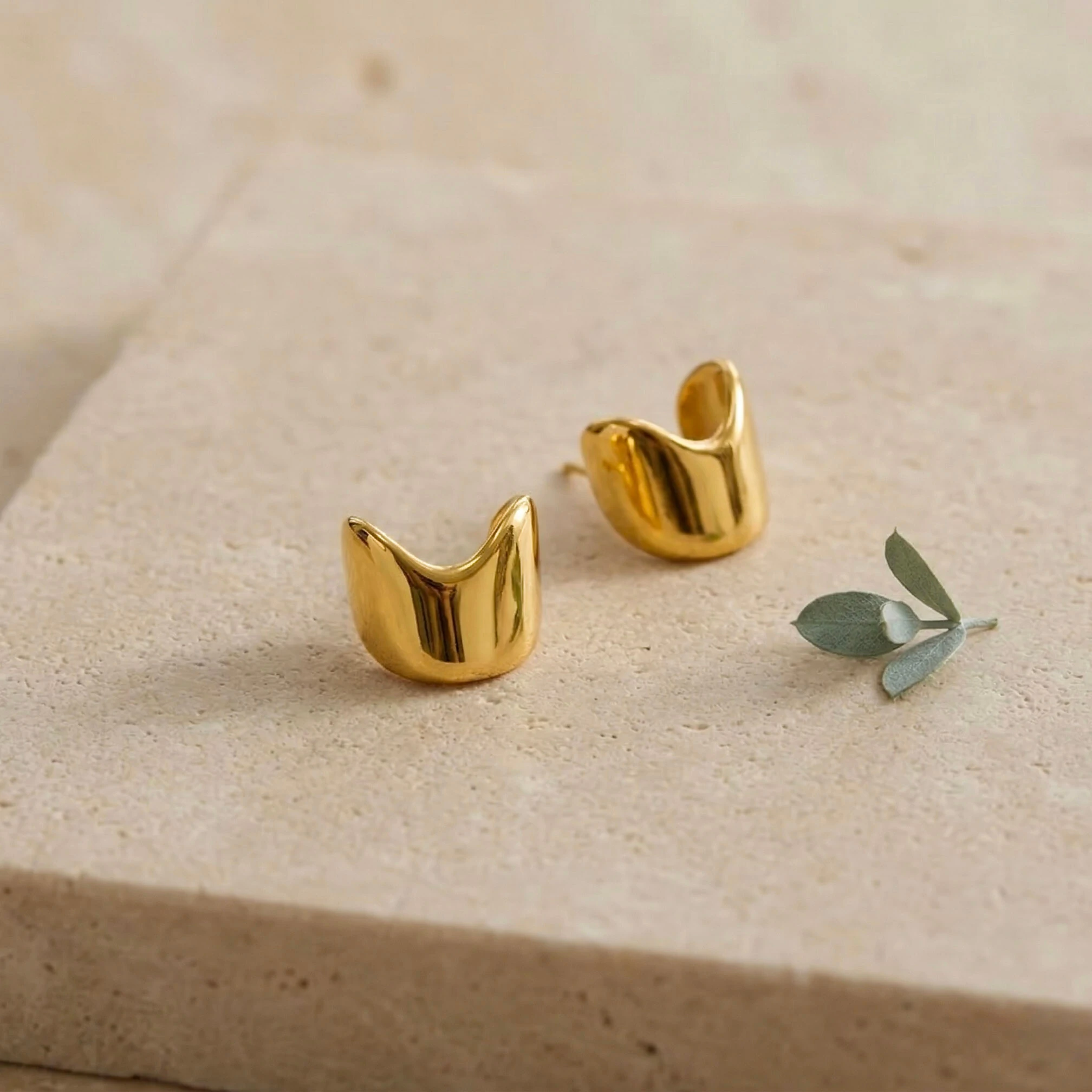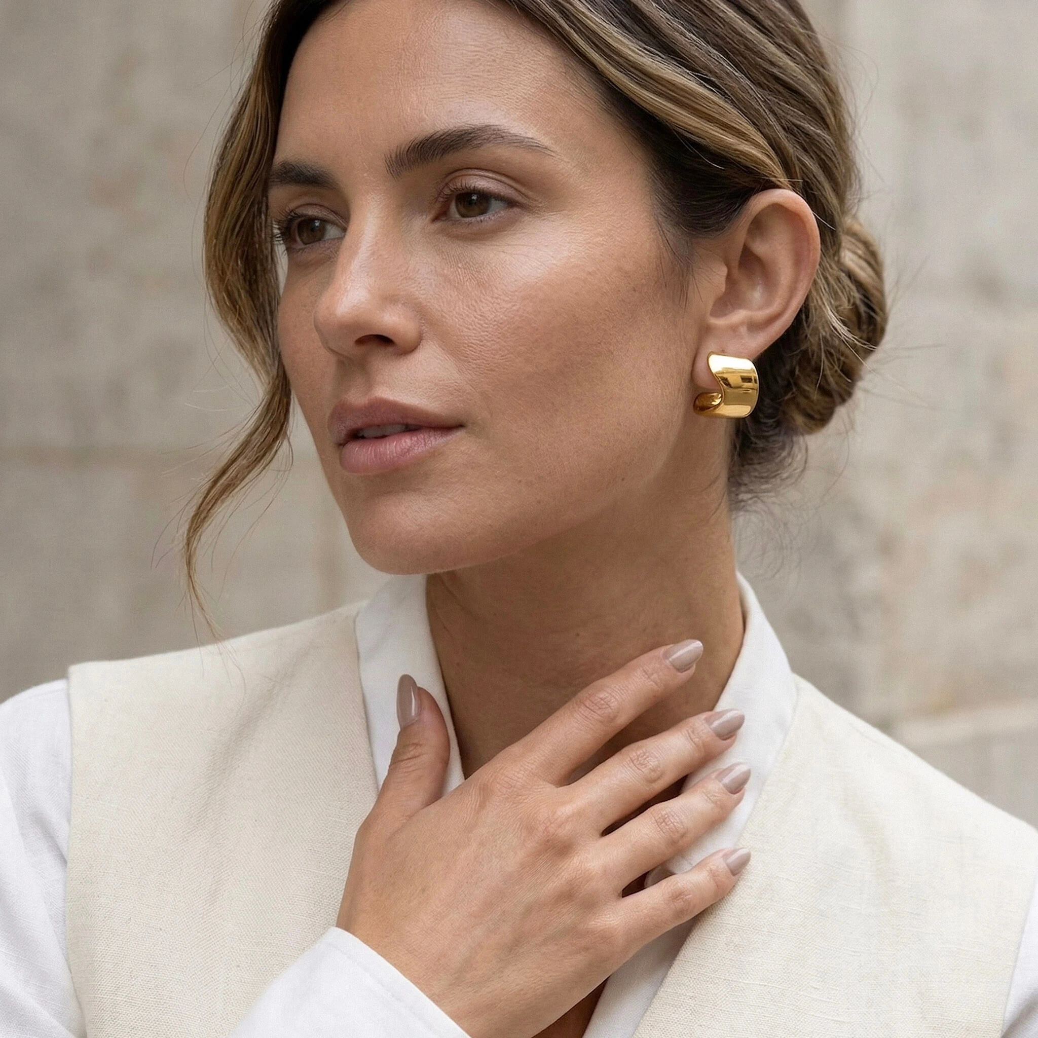 O Brinco Orbe traz um desenho orgânico e contínuo, com acabamento polido que reflete a luz de forma suave.