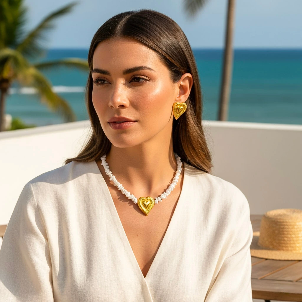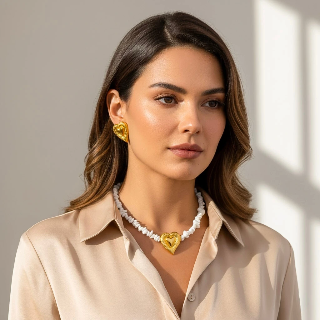 O Colar Liora traz a silhueta icônica de coração com textura orgânica e banho ouro 18k que ilumina o colo com elegância.