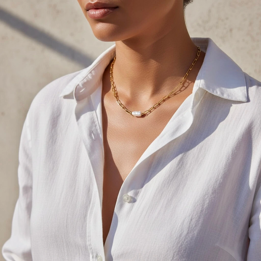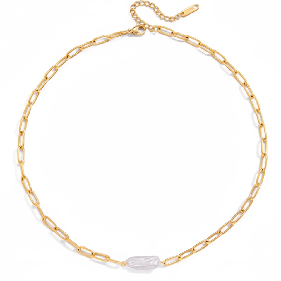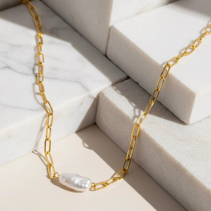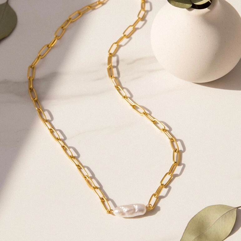 O Colar Pérola Barroca e Elos Delicados é a combinação perfeita entre o clássico e o contemporâneo.
