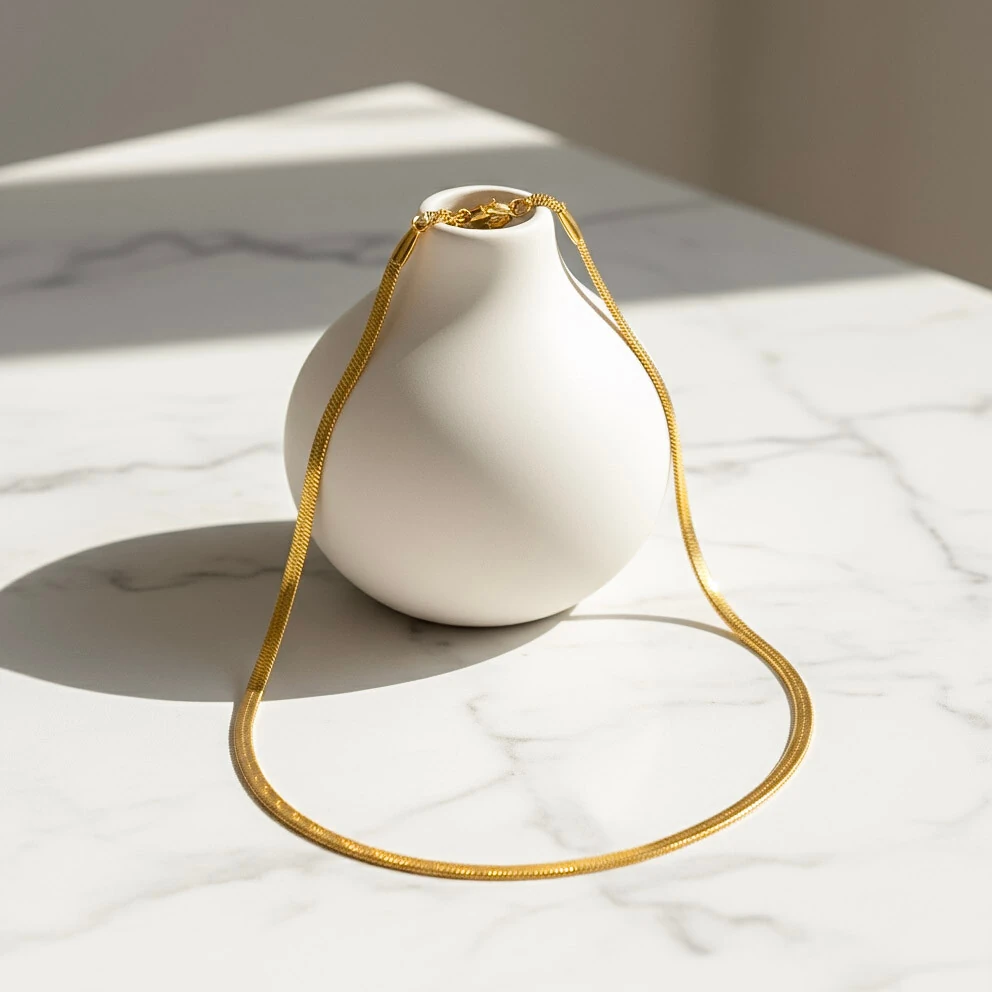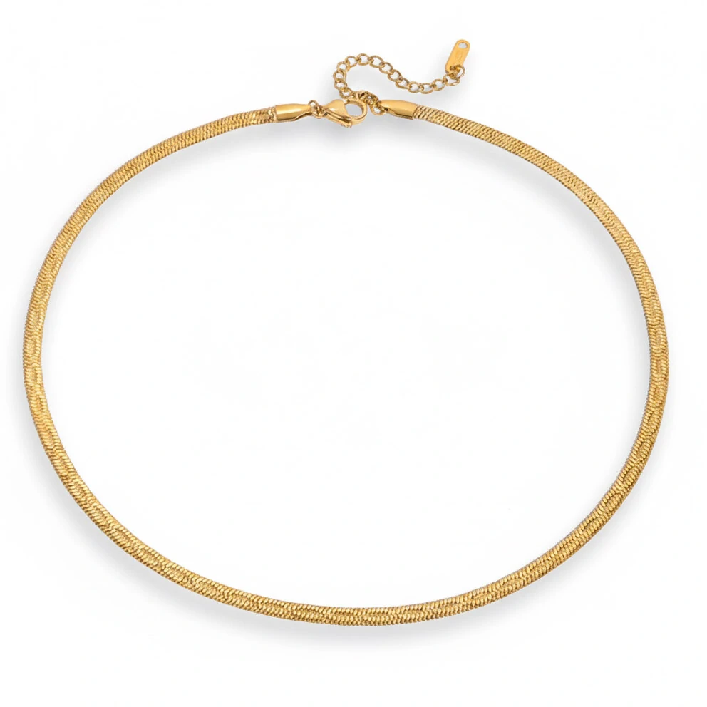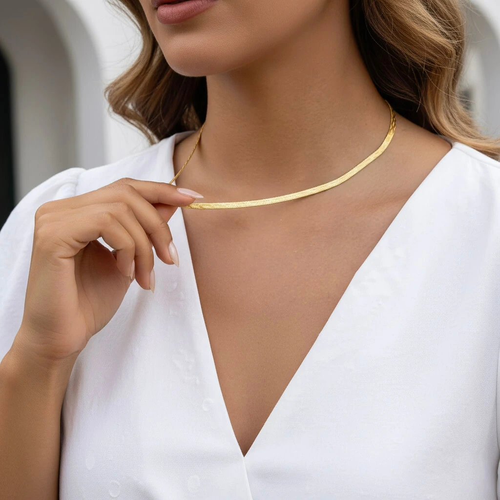 O Colar SOFIA é a peça fundamental para o seu Layering de luxo. Com o design maleável (Fita) da Malha Snake,