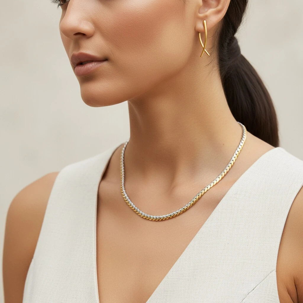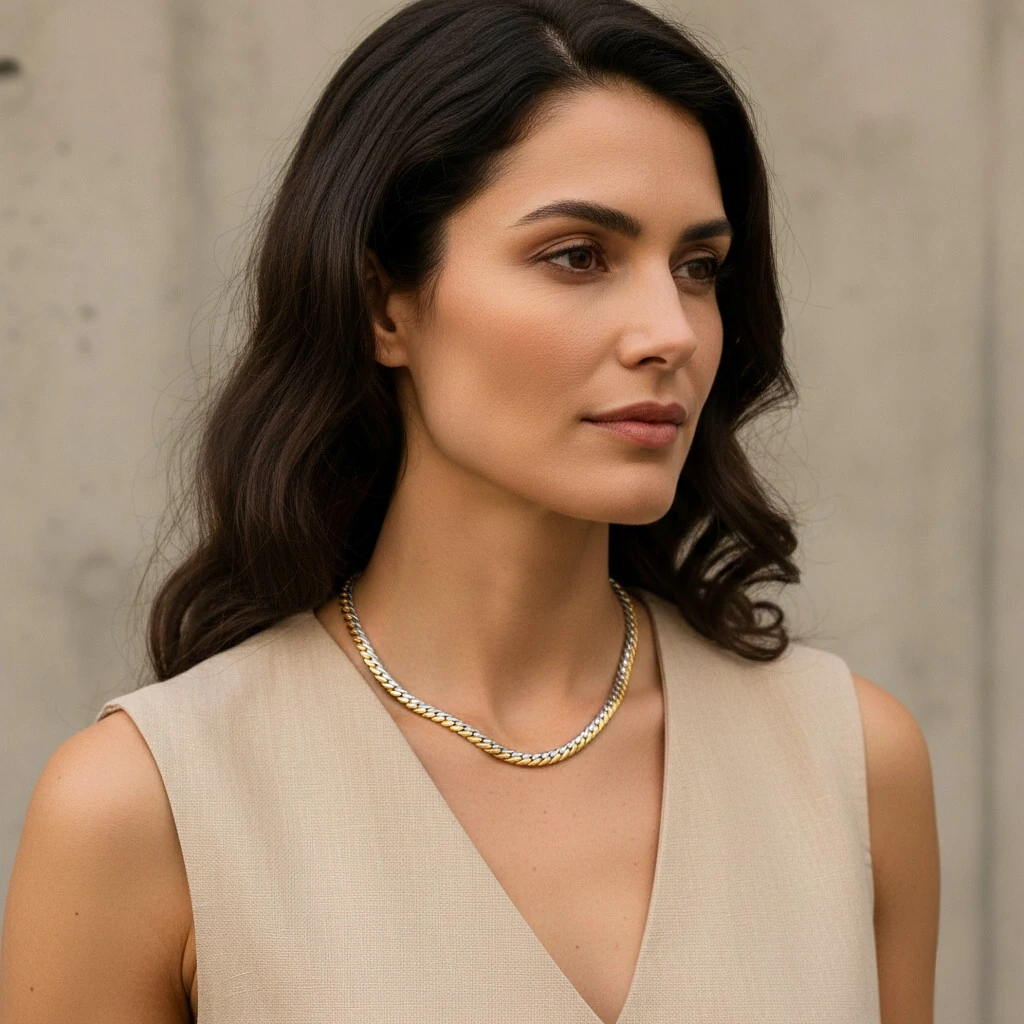 use o Colar Marais sobre um blazer de alfaiataria fina em tons neutros (como off-white ou areia).