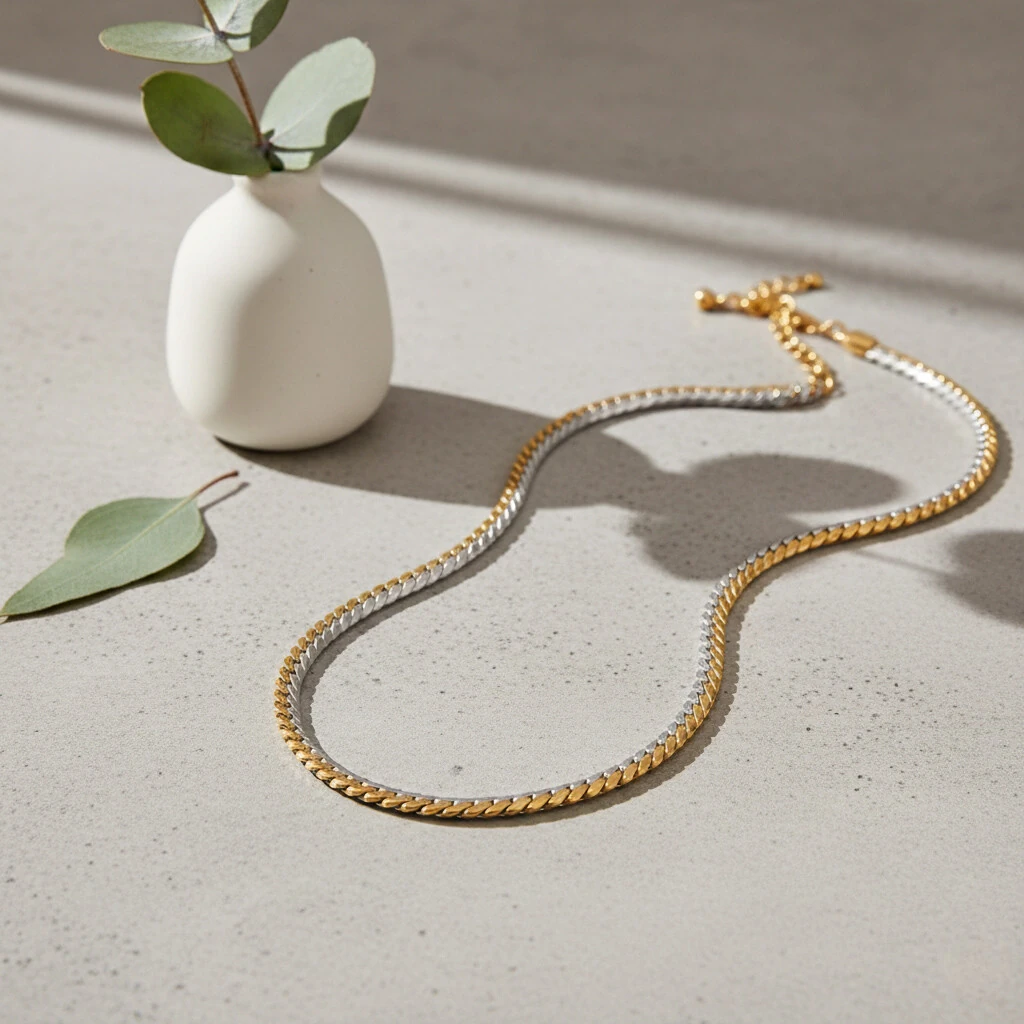 Eleve seu estilo com o Colar MARAÍS, uma peça statement que celebra o encontro perfeito entre o Ouro 18k e o Ródio.