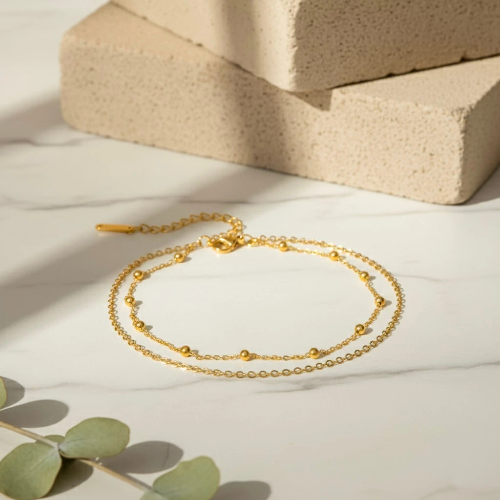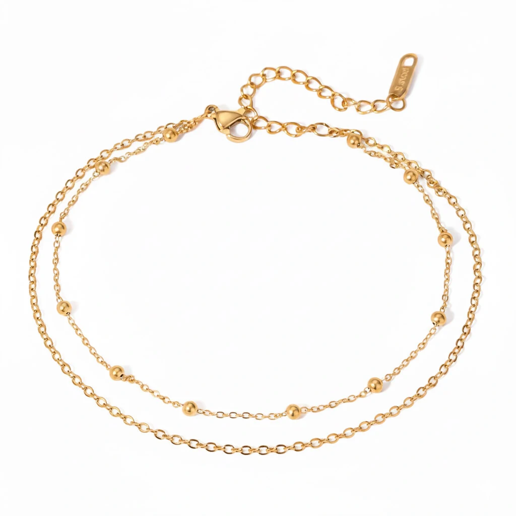 Este design Minimalista já resolve o Layering (camadas), combinando duas correntes finas com um toque sutil de bolinhas polidas.