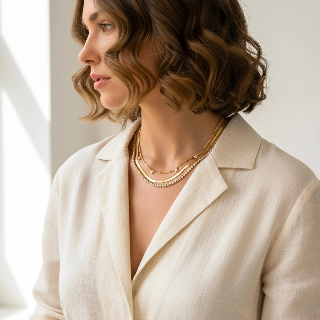 Layering 3 em 1: Solução completa que combina Textura (Snake) e Brilho em uma única peça, elevando o visual do decote.