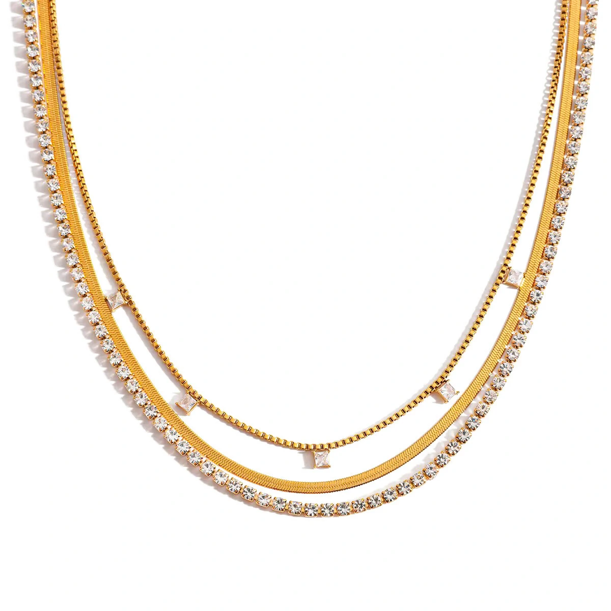 Este Layering combina a tendência Bold da Malha Snake (Malha de Cobra) com duas correntes cravejadas com zircônias.